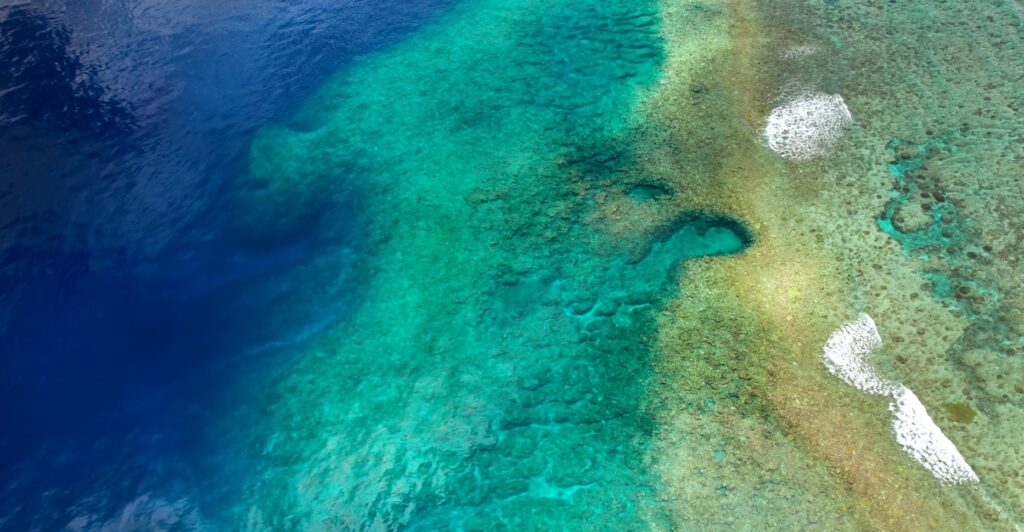 サンゴ礁に波が優しく打ち寄せ、ターコイズ色の海に太陽の光が降り注ぎます。