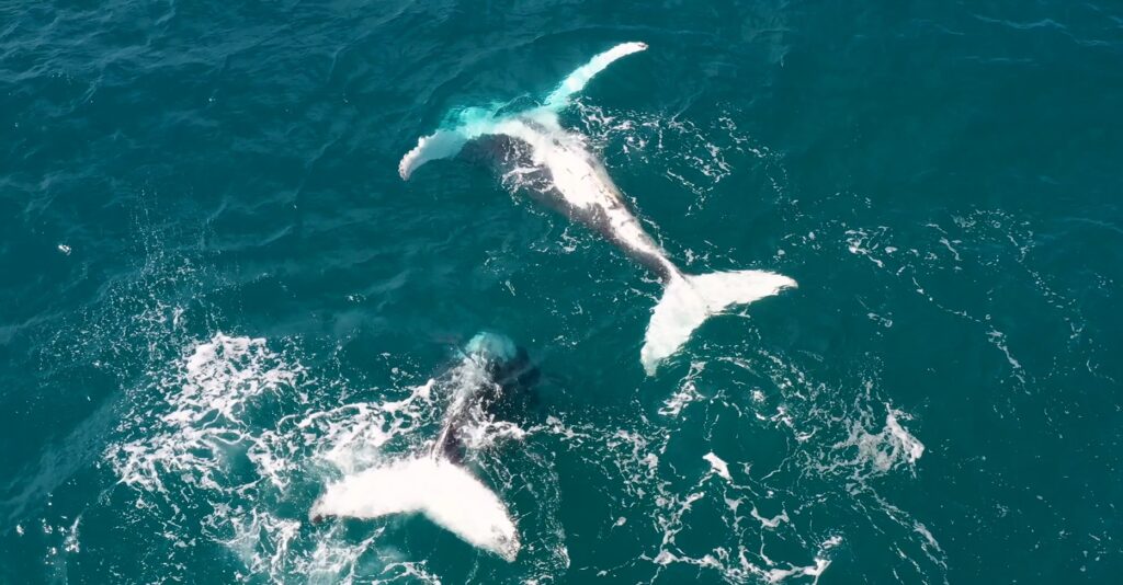 フレーザー・コースト沿いにある透き通った海で、2頭の大型回遊クジラが優雅に泳いでいます。
