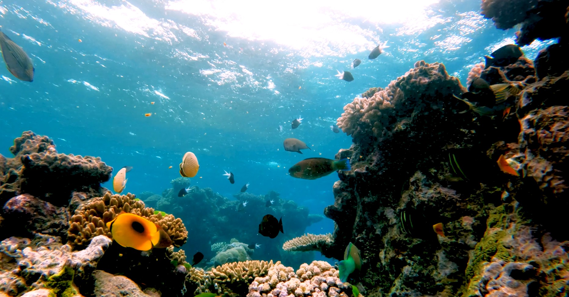水中では大小さまざまなカラフルな熱帯魚が泳いでいるのが確認できます。