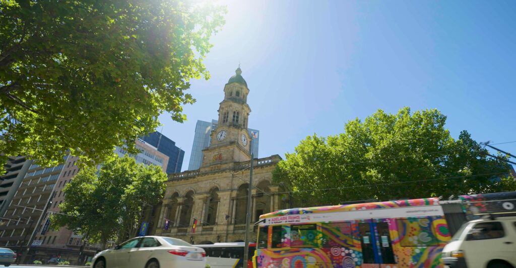 アデレード市内には路面電車が走っています。アデレード・タウン・ホールの前を通り過ぎていきます。