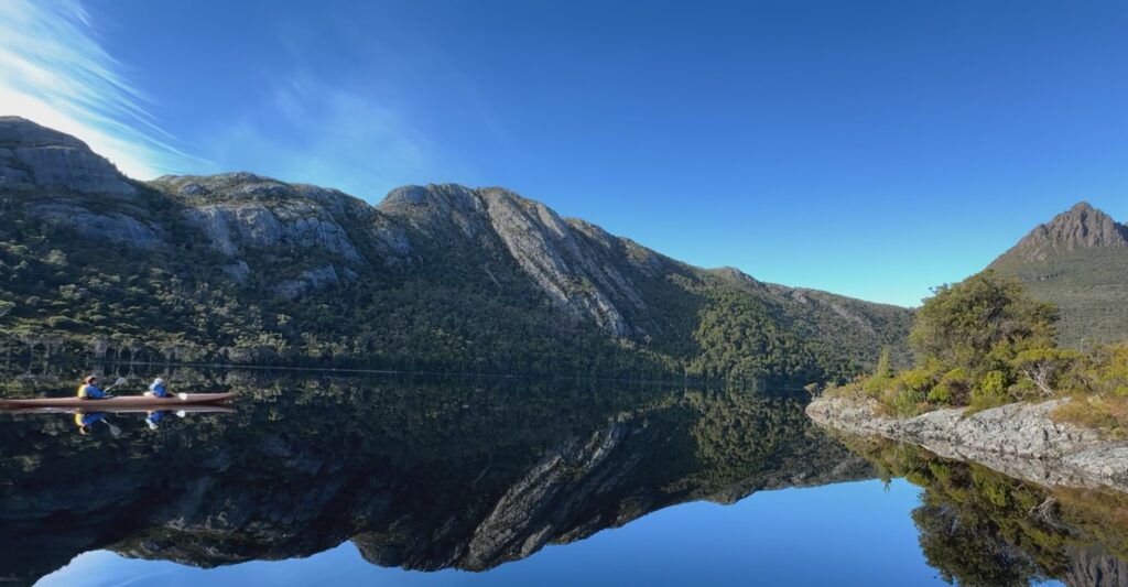 クレイドル・マウンテンにある湖では、水面が鏡のように周囲の風景を映し出します。